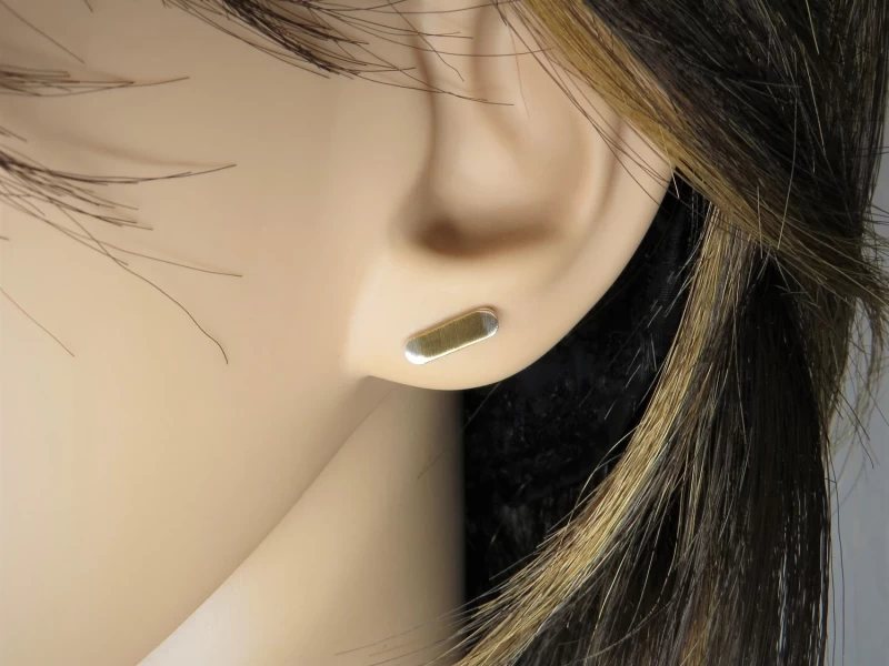 Gold Ohrstecker Damen aus kleinen Balken an deren Spitzen silberne Halbkreise sind. Die Goldohrstecker für Damen sind aus 750er Gold gefertig inklusive der Stifte und Muttern. Die silbernen Spitzen sorgen für einen schönen kleinen Akzent und machen diese Ohrstecker zu etwas besonderem. Jedes Paar wird handgefertigt, aus einem Blech geschnitten und zusammengesetzt. Die Ohrstecker aus Gold sind dezent und eignen sich für jeden Anlass.