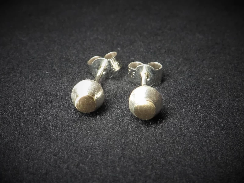 Ohrstecker Kugel Silber mit einem aufgelöteten Plättchen aus echtem 750er Gold. Die Kugelohrstecker aus Silber sind somit edel und und wirken durch die gebürsteten Flächen wild zugleich. Die Kugeln wurden aus eingeschmolzenem Silberblech hergestellt und sind aufgrund dieser Herstellungsart nicht komplett gleichmäßig rund, wodurch ein zusätzlicher Reiz entsteht.